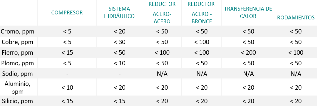 Los parámetros metalográficos revelan la presencia de metales de desgaste en el aceite, con lo cual se puede demostrar si existe daño excesivo de componentes específicos. Los parámetros comunes incluyen: